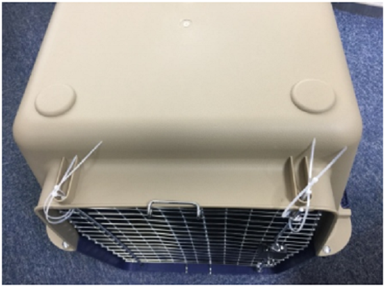 如果您使用的是分體式航空專用旅行容器,容器所有連接部位的鎖扣必須完好,鎖扣、螺栓及螺母不能有缺失;同時,門和箱體需要使用外加方法鎖牢,但外加方法不得導致小動物受傷(如圖2)